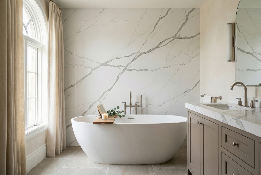 Calacatta Aspro pairs a crisp white base with gentle, organic grey veining. Clean, elegant, and effortlessly timeless.