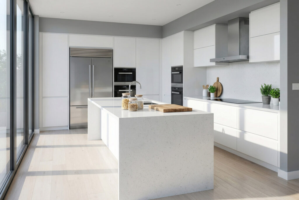 A bright white stone with fine, evenly dispersed speckling that creates a soft, luminous finish. Starlight brings clarity and freshness to any space, offering a modern aesthetic that pairs effortlessly with both light and dark cabinetry. Ideal for kitchens, bathrooms, and commercial interiors.