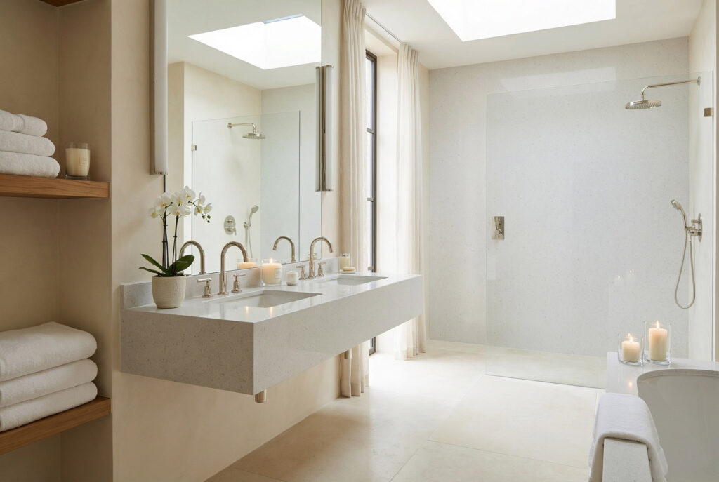 Subtle yet refined, Starlight showcases a clean white surface accented with fine, natural speckling that adds gentle texture without visual noise. Its balanced, uniform appearance makes it an excellent choice for benchtops, splashbacks, vanities, and feature surfaces where simplicity is key.
