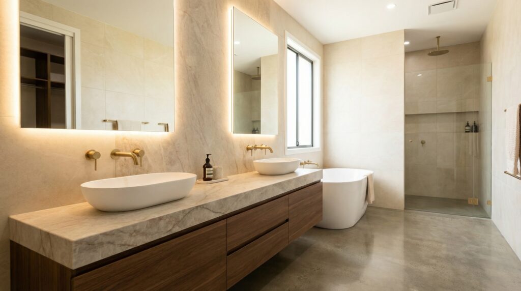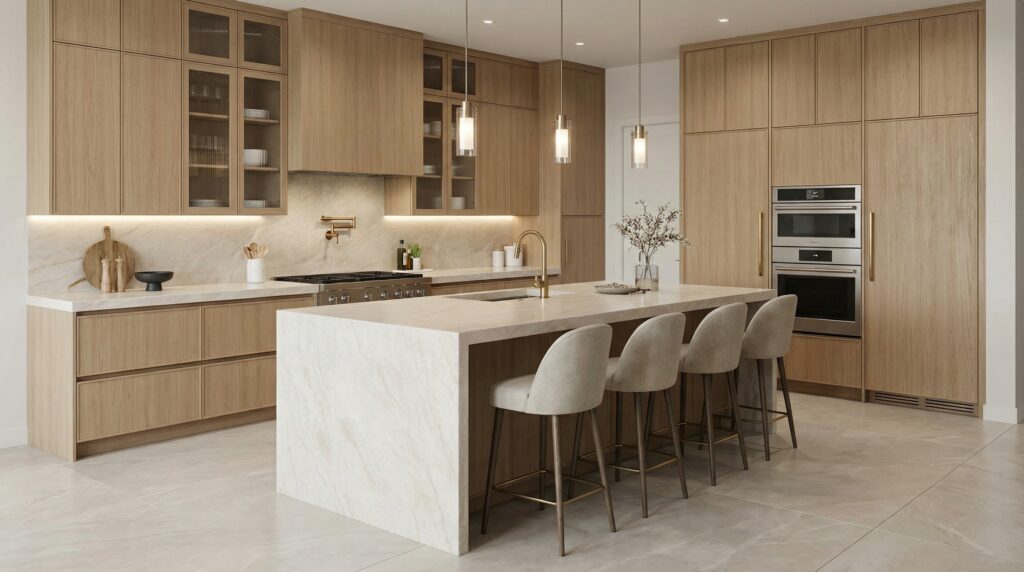 A luminous ivory surface delicately traced with soft blush and warm biege veining. Its understated movement and airy tone create a sense of calm sophistication, making it an ideal choice for contemporary, transitional, and classic interiors alike.